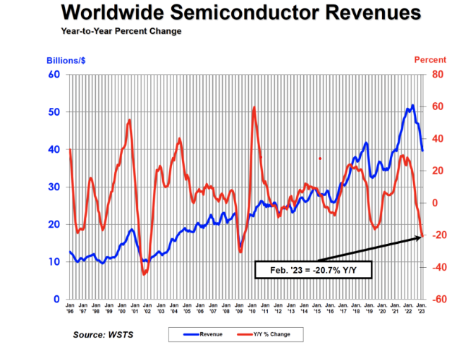 据半导体产业协会(SIA)数据,2月份全球半导体销售额从2022年2月份的500亿美元骤降至397亿美元,下降了20.7%,创2009年以来最大年减幅。