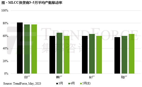当前MLCC被动元件库存调整渐近尾声,MLCC价格跌幅渐弱向稳,出货量渐涨,或释放出行业触底信号。据TrendForce集邦咨询统计,今年1-4月MLCC供应商总出货量为13,590亿颗,同比减少34%。第二季至今,MLCC供应商持续控制产能降载,以维持供货、库存、价格三者间的平衡。5月份日厂平均产能稼动率为78%;陆厂、台厂、韩厂则约60-63%。