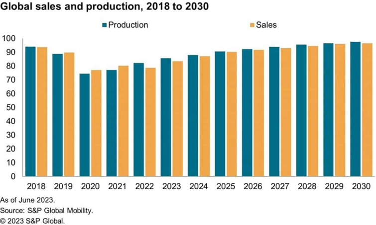 随着汽车制造商和供应商适应当前环境,2023年的产量有所增加,销量随着库存的增加而改善。尽管如此,根据标准普尔全球流动性分析,疫情爆发前全球汽车产量达到 1 亿辆的势头已经倒退了十年。