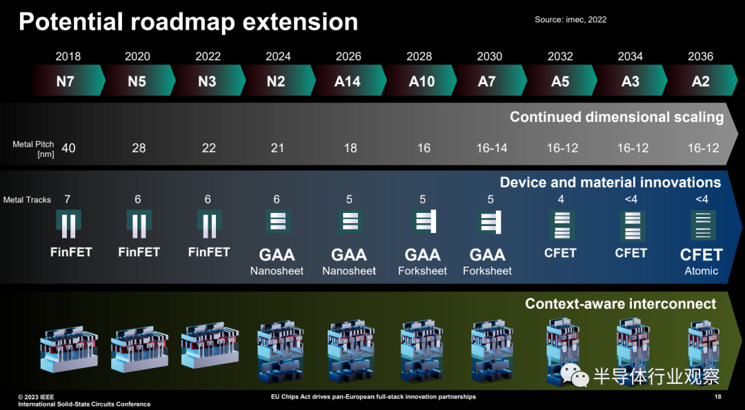 这也能解释为什么半导体工艺节点特征尺寸微缩虽然从十五年前开始就遇到物理极限的挑战,但是整个半导体行业仍然不惜代价地投入研发成本让半导体工艺节点特征尺寸继续缩小,因为只有这样才能保证半导体行业不至于落入夕阳产业的陷阱。直到今日,摩尔定律作为一个半导体行业的发展路线图仍然具有强大的生命力,而这也是因为整个行业能不停地提出新的技术解决方案。例如,IMEC在去年公布的半导体工艺路线图中,晶体管的特征尺寸仍然将在未来的十多年中保持每两年集成度翻倍(即晶体管特征尺寸每两年减小到0.7倍)的规律继续缩小,到2036年预计晶体管特征尺寸将达到0.2nm,可见摩尔定律中描述的晶体管特征尺寸缩小仍然可以维持很长的一段时间。